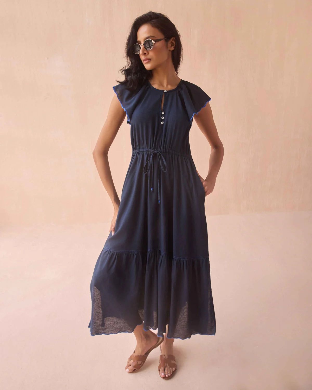 The floor is yours in this statement-making midi. A free-spirited silhouette gets a kiss of refinement from a cinchable waist, paired with a flowing skirt and delicate cap sleeves that frame the shoulders..
